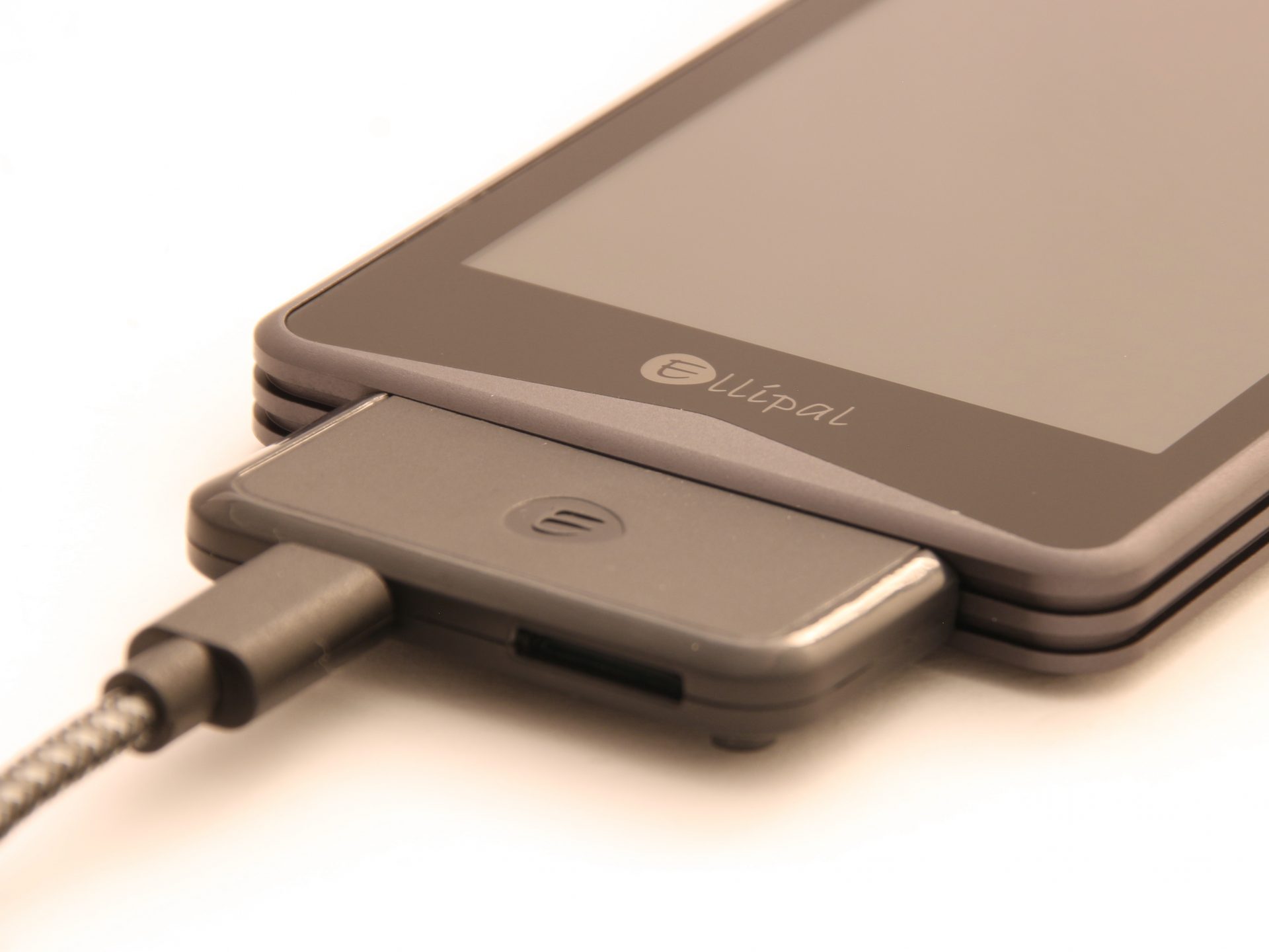 In addition to the ELLIPAL Titan hardware wallet, the package also contains a quick start guide, a congratulations card, two stickers and a piece of paper to write down the recovery key. Also included is the Ellipal safety adapter. This can be connected to the connectors on the bottom of the ELLIPAL Titan and offers a micro-USB port for charging the device. For this purpose, you can use the short USB-A to Micro-B charging cable, which is also attached. In addition, the adapter has an input for a Micro SD card, which allows to update the firmware. However, the SD card required for this is not included in the scope of delivery.