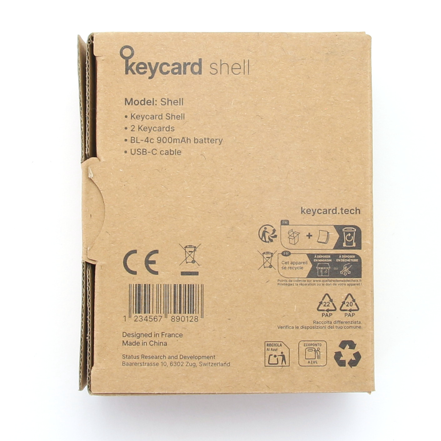 The packaging of the Keycard Shell is pleasingly simple and functional. The manufacturer relies on ecological packaging made from recycled cardboard, which is an important aspect in today’s world and stands out positively. In the box you will first find the centerpiece, the keycard shell itself. As the device has a modular design, the battery is supplied separately and must be inserted by the user.