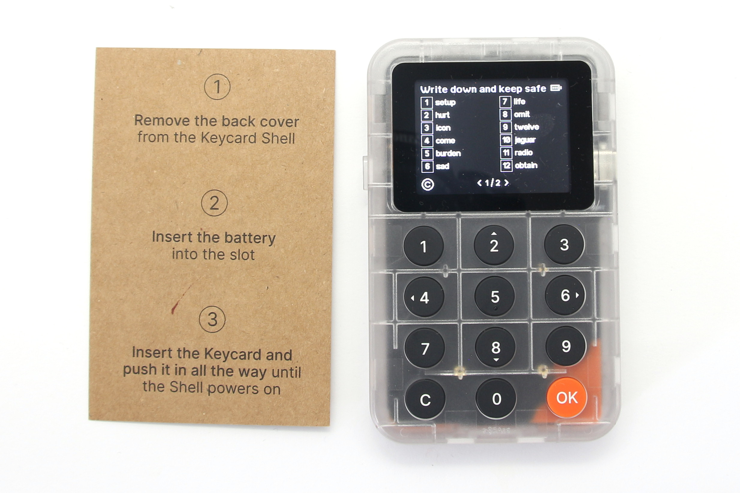 The setup process for the Keycard Shell differs slightly from conventional hardware wallets, as two components have to be brought together here. First, the battery must be inserted into the compartment on the back. As soon as you insert a keycard into the slot, the device starts automatically. Communication between the shell and the card takes place internally and, according to the manufacturer, the private keys never leave the secure element of the card.